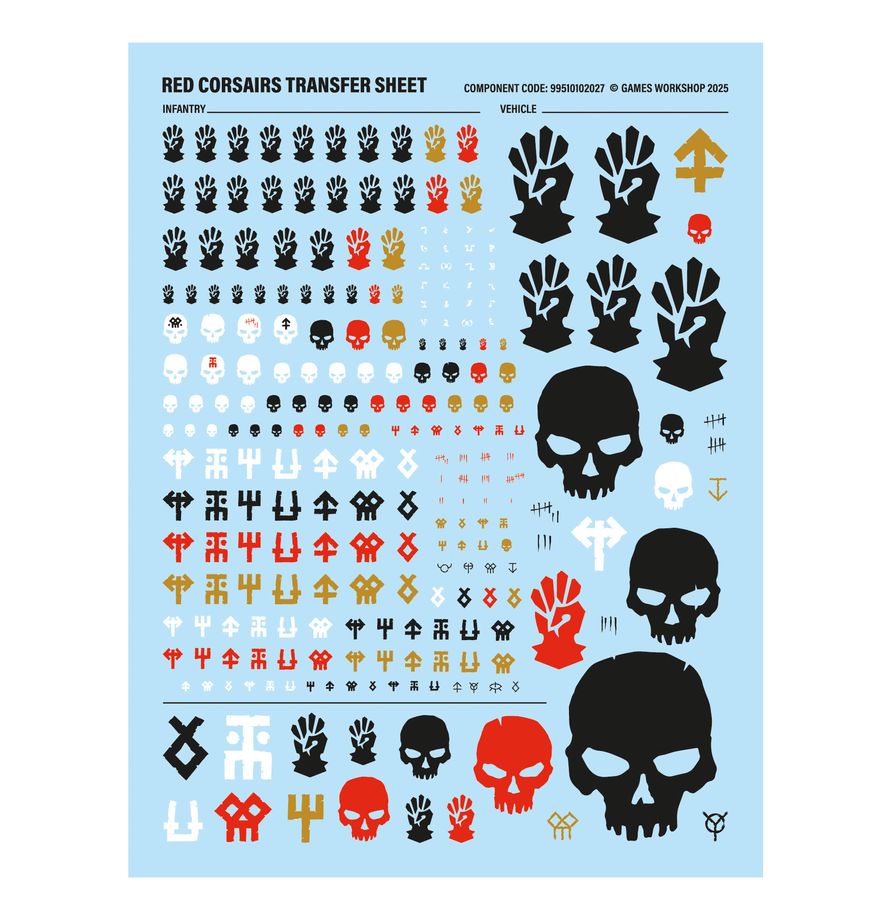This kit is also supplied with 1 Red Corsairs Transfer Sheet, featuring 248 high-quality waterslide transfers. These include a selection of infantry and vehicle-sized transfers depicting Red Corsairs iconography, skulls, kill tallies, and other cursed sigils.